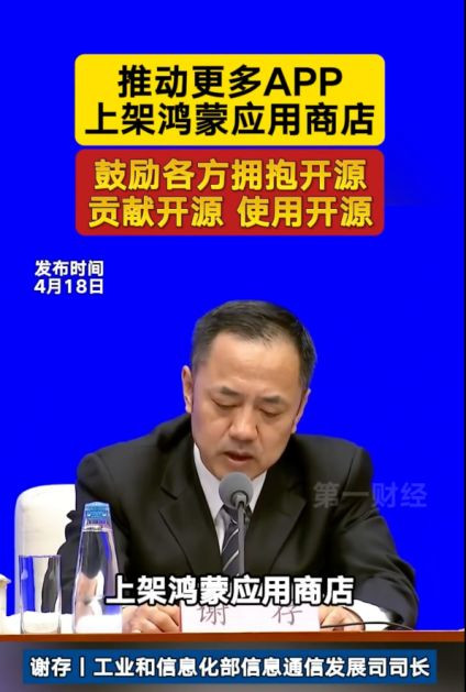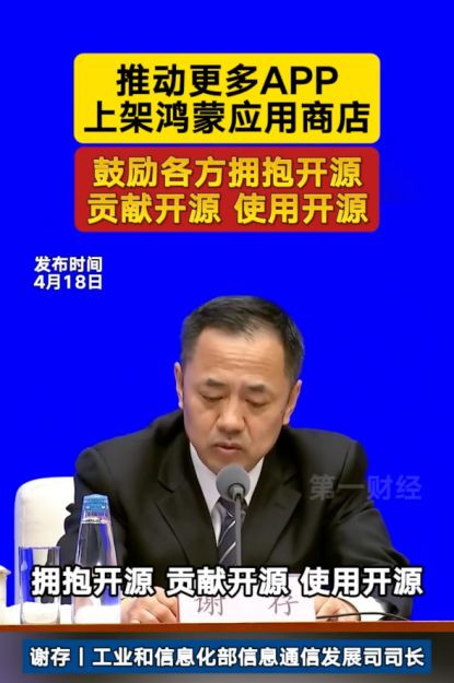 2025年4月18日,工业和信息化部在国务院新闻办公室举行的新闻发布会上释放出一个重磅信号:推动更多APP上架鸿蒙应用商店,满足群众多样化需求,同时鼓励各方以更开放的姿态拥抱开源、贡献开源、使用开源。